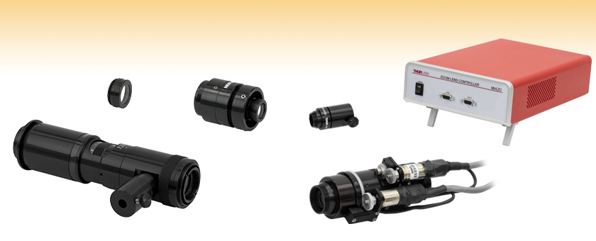 Thorlabs' Zoom Lenses are ideal for high-magnification machine vision and imaging applications, providing an optimal balance between optical performance and a large zoom range. These zoom lenses must be used with an extension tube (sold below), and can optionally be used with the appropriate 6.5X or 12X system magnifying lens attachment (also sold below). Each zoom lens is available with either manual or motorized adjustment, with a separate controller for the motorized versions (sold below). More information on the connections and specifications of the motorized zoom lenses can be found in the Motorized Lenses tab.