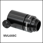 These fiber input attachments are compatible with our MVL6X3M and MVL12X3M motorized zoom lenses with a coaxial illumination port. The MVL6X8C attachment has 11/16"-32 external threading for use with the MVL6X3M zoom lens, while the MVL12X8C has 0.812"-32 external threading for use with the MVL12X3M zoom lens. A Ø0.32" (Ø8.0 mm) opening provides compatibility with fiber optic illuminators, like the OSL2 fiber light source. Figure G6.1 shows an MVL6X3M motorized zoom lens with the MVL6X8C input attached.
