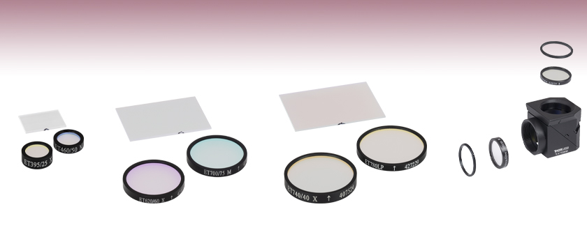 Since standard fluorescence imaging applications generally incorporate three different filters (i.e., one excitation, one emission, and one dichroic filter) to maximize the signal-to-noise ratio, Thorlabs offers these filters as a set at a savings over purchasing each compenent separately. Some excitation, emission, and dichroic filters are only available as a matched set and are not available for purchase individually. These filters and filter sets are compatible with our 30 mm Cage Cubes for 25 mm filters. For customers who wish to use these filters in Thorlabs, Olympus, or Nikon fluorescence microscopes, Thorlabs manufactures a family of Drop-In Microscope Filter Cubes.