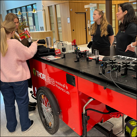 Meanwhile, our efforts are extending internationally as we adapt this model to serve students in Europe. The introduction of a mobile lab on three eco-friendly wheels aligns with our commitment to sustainability, ensuring minimal environmental impact as we continue to share photonics education. In Europe, where space is often limited on university campuses, our mobile lab's compact design is well-suited. This mobile lab is easily maneuverable and akin to a friendly arrival on a bike, carrying the equipment and people needed to facilitate learning experiences.
