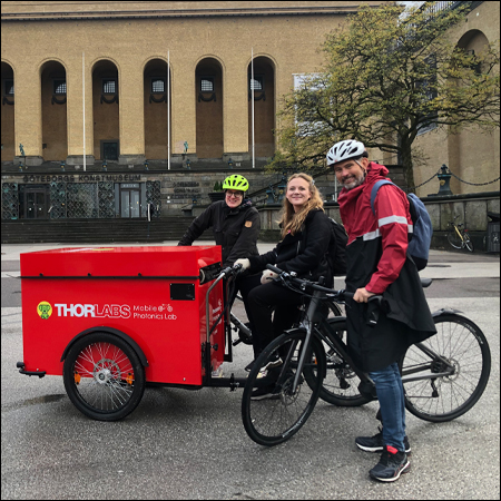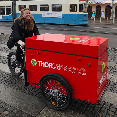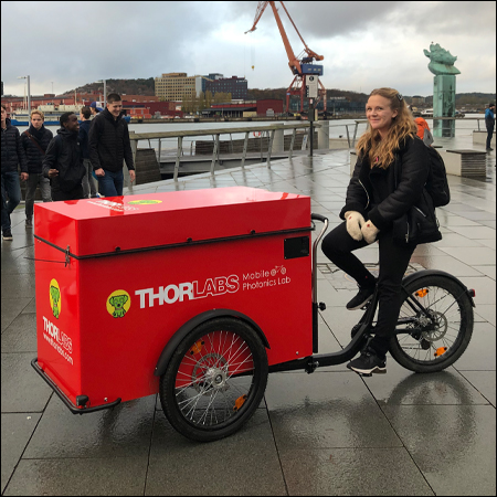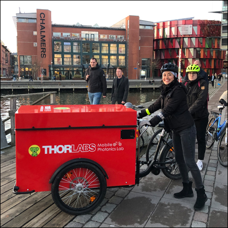 The Mobile Photonics Lab's third trip saw it visit Göteborg, Sweden. The bike embarked from the Thorlabs Sweden office and traveled to the Optics & Photonics in Sweden tradeshow at Lindholmen Science Park, where it exhibited for two days. Afterwards, the team traveled to the University of Gothenburg for a demonstration before visiting the Chalmers University of Technology.