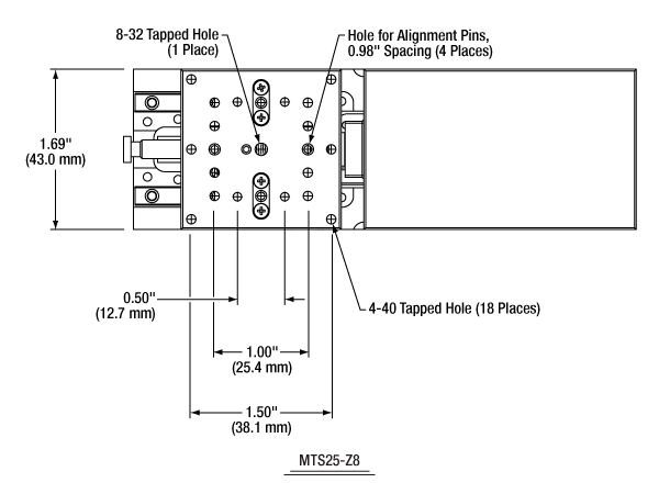 Thorlabs' MTS25(/M)-Z8 Motorized Translation Stage provides 25 mm (0.98") of electronically controlled linear travel along a well-defined axis. Each stage is equipped with a 1.50" x 1.50" (37.5 mm x 37.5 mm) tapped hole matrix that includes eighteen 4-40 (M3 x 0.5) taps and a centered 8-32 (M4 x 0.7) tap.