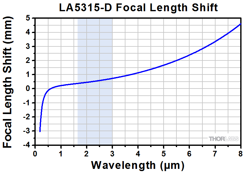 The focal length of a lens is wavelength dependent. The focal length listed in Tables 3.1 and 3.2 for a given lens corresponds to the value at the design wavelength (i.e., the focal length at 588 nm). Since CaF2 offers high transmission from 0.18 - 8.0 µm, users may wish to use these lenses at other popular wavelengths. Click on the graph icons in Tables 3.1 and 3.2 to view theoretically-calculated focal length shifts for wavelengths within the 0.18 - 8.0 µm range.