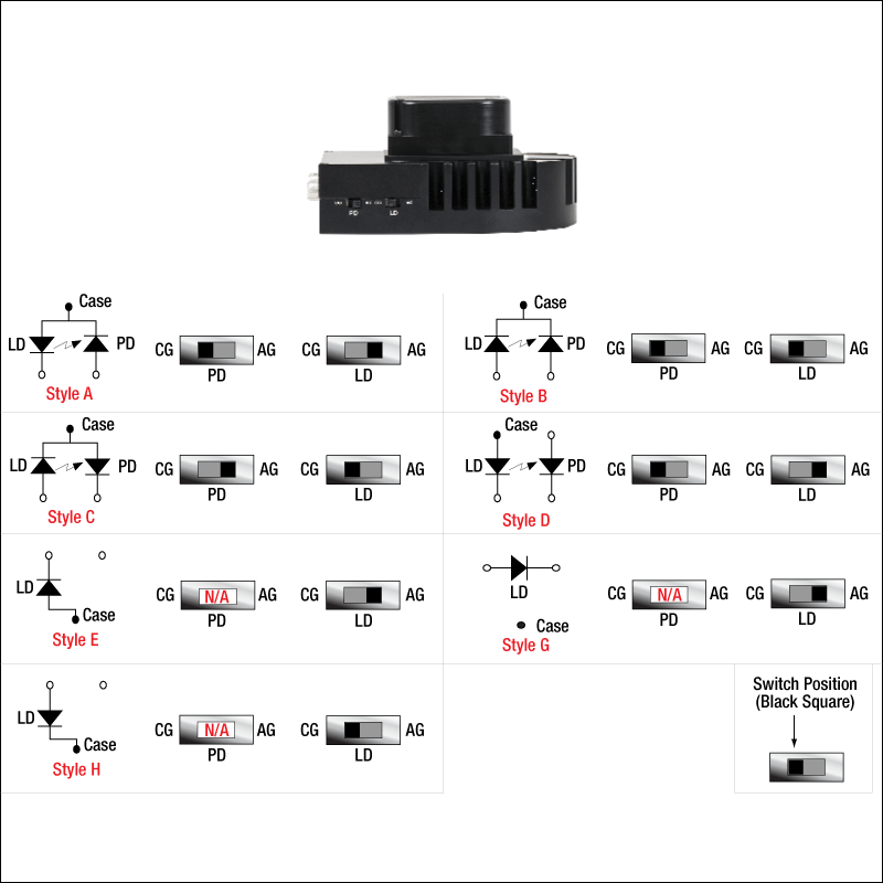 The LDM9LP is compatible with A, B, C, D, E, and G pin configurations. Figure 2.2 illustrates how each pin code should be aligned with the socket on the laser mounting PCB. Two jumper pins, shown in Figure 2.3, also need to be set. Settings are outlined in Tables 2.4 and 2.5. The BYPASS jumper should be set only if the laser is modulated via the LD Driver input.