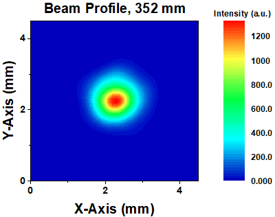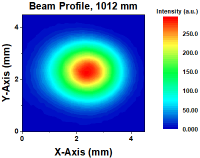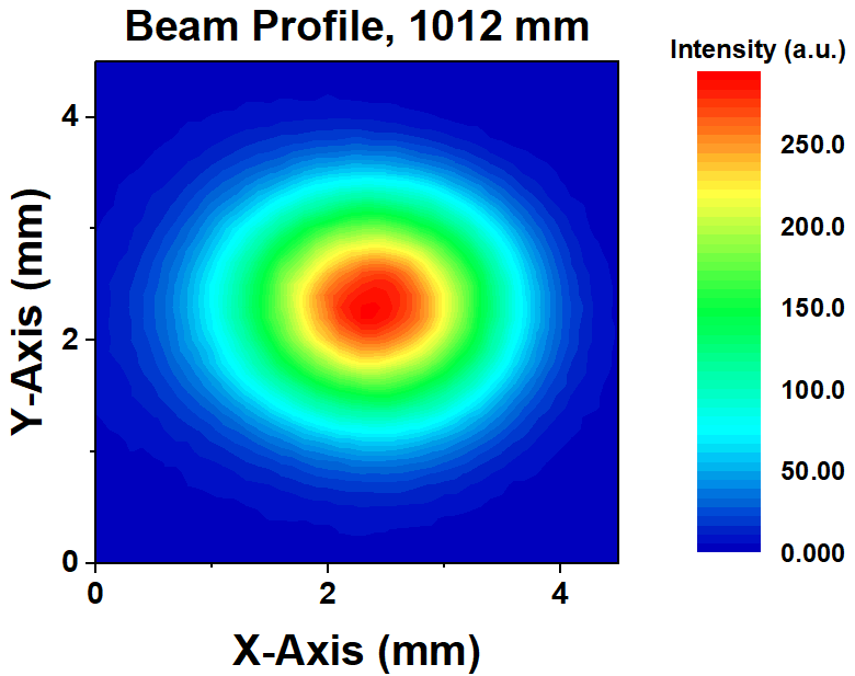 Figure 817B shows the second-order moment (D4σ) beam widths for the parallel and perpendicular directions as a function of distance from the laser. Along the parallel direction, we obtained a minimum beam width of 1.5 mm, while along the perpendicular direction, we obtained a minimum beam width of 1.4 mm. The spatial profiles were observed along the beam path using the pyroelectric camera, with two examples shown in Figures 817D and 817E.
