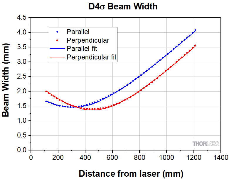 In order to obtain the hyperbola coefficients a, b, and c for the parallel and perpendicular directions, we fit the discrete beam width measurements along each direction to hyperbolas, as shown in the graph in Figure 817B These coefficients were substituted into Equation 2 (taking λ = 4.595 µm) to yield M2.