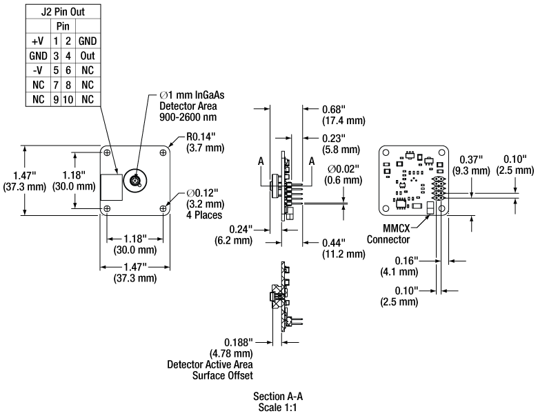 These photodetectors are capable of driving loads from 50 Ω to Hi-Z with the output being accessible through a jumper or an MMCX connector on the rear of the printed circuit board (PCB). Each detector PCB has four Ø3.2 mm (0.12") through holes on a 30 mm square grid for compatibility with our 30 mm cage system or mounting in custom housings and devices.