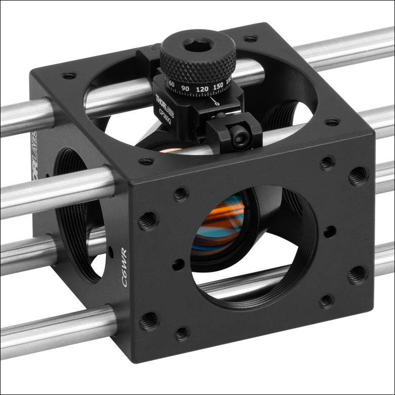 The polarization beamsplitting cube sits upon a B4CRP precision rotation platform and is held in place with a B6C cage cube clamp. The precision rotation platform allows for precise alignment of the polarization beamsplitting cube relative to the incident laser beam and also yields control over output beam alignment. This assembly is mounted within a C6WR 30 mm cage cube with ER cage rods attached to hold a half-wave plate and rotation mount. The rotation mount is a CRM1PT which is designed for integration into a 30 mm cage system. The precision control over the rotation is particularly useful when attempting to maximize or minimize a beam throughput. The zero-order mounted half-wave plate threads directly onto this rotation mount.
