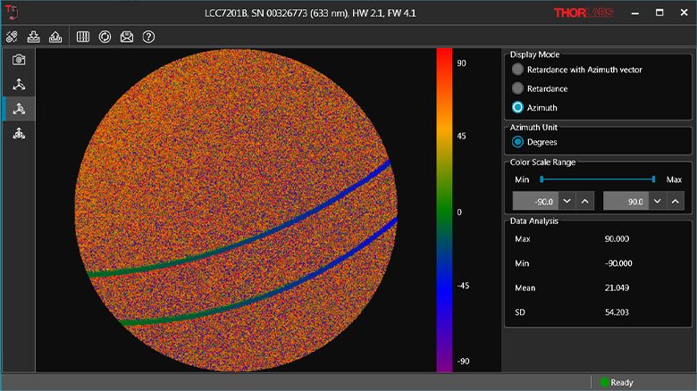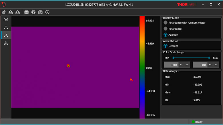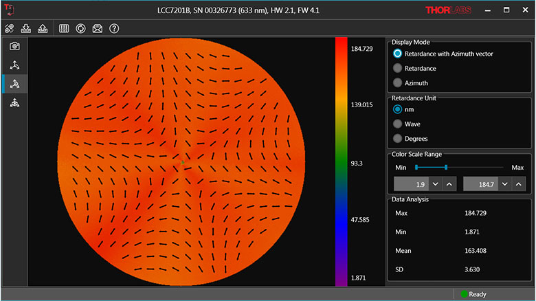 These two modes provide two ranges of measurement accuracy: Standard Retardance Range and Low Retardance Range. Standard Retardance provides a measurement accuracy of ±10 nm for retardances in the 0 nm to 316 nm range and ±3° for azimuths over the entire measurement range. Low Retardance Range will improve the measurement accuracy to ±1 nm for retardances in the 0 nm to 100 nm range and ±1° for azimuths over the entire measurement range. The minimum exposure time is 0.021 ms, and the maximum exposure time is 7330 ms.
