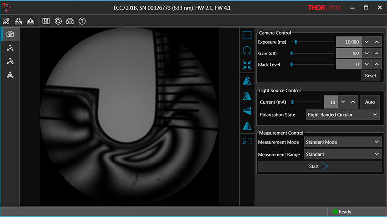 The LCC7201C software includes two modes, Standard Mode and Low-Noise Mode, to measure a sample's retardance. Standard Mode provides a higher measurement rate with a lower signal-to-noise ratio, while Low Noise Mode provides a lower measurement rate with a higher signal-to-noise ratio. An exposure time of 10 ms is set as the default, which allows a measurement to be finished within 20 seconds in Standard Mode and 4 minutes in Low Noise Mode.