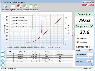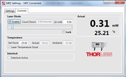 The S4FC software package allows the user to control settings and display features of the benchtop laser source. The package enables several helpful features for controlling the device including setting an output limit, starting the device from the last setting (instead of at 0 mW or threshold power), adjusting the device by current (instead of mW), dimming the display intensity, or enabling the temperature LED to blink when the device is not at its temperature setpoint (making it visually easier to observe when the laser is not at thermal equilibrium). Additionally, the GUI may be utilized to select the temperature setpoint and power output of the device, as well as enabling the laser's output.
