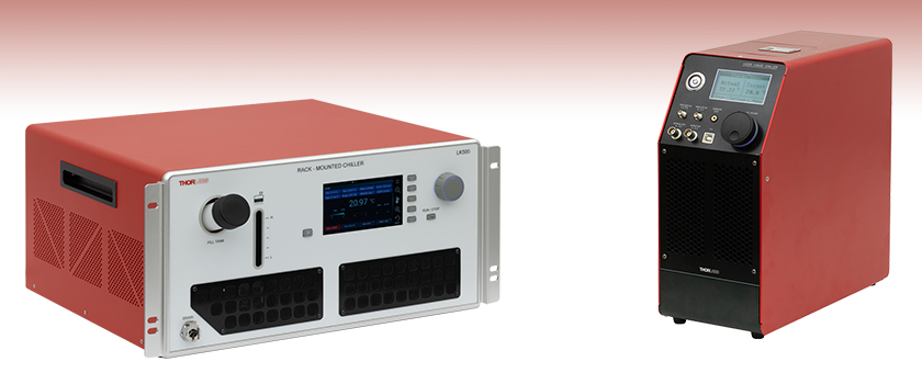 Thorlabs’ Liquid Chiller Cooling Systems are air-cooled liquid chillers that provide up to 200 W of cooling for the LK220 benchtop unit or 500 W of cooling for the LK500 rack-mounted unit, for applications requiring greater cooling capacity. The LK220 chiller provides 1.2 bar (17.4 psi) of pumping capability and ±0.1 °C temperature stability, making it an ideal benchtop solution for heat dissipation. The LK500 chiller provides 0.8 bar (11.6 psi) of pumping capability and also has ±0.1 °C temperature stability. These chillers can operate at low noise levels while also achieving high temperature accuracies of 0.01 °C. For more information about the cooling capacity and flow performance, please see the Graphs tab.