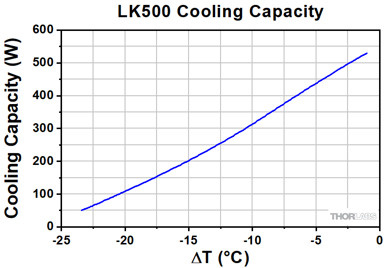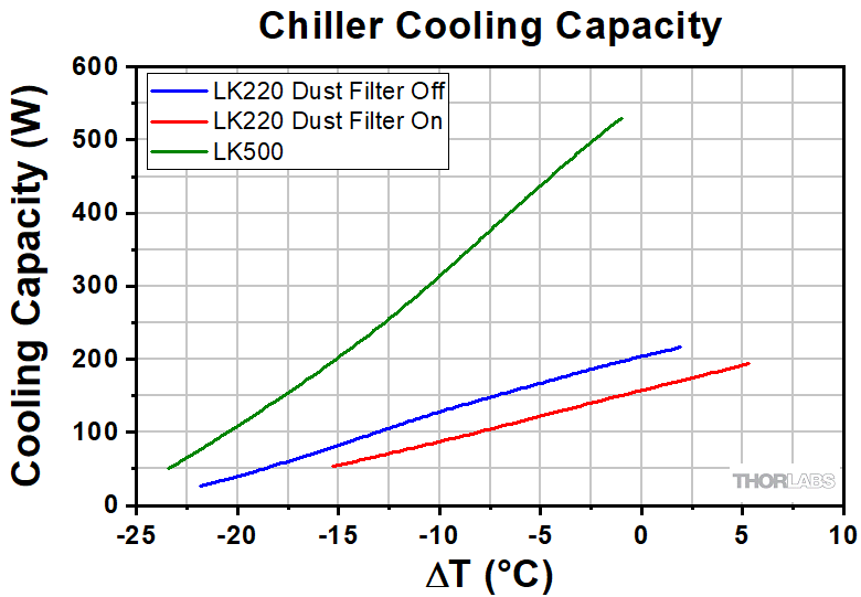 This data reflects the typical performance of Thorlabs' LK220 and LK500 chillers, and is presented for reference only. The guaranteed specifications are shown in the Specs tab, however, performance may vary from unit to unit.