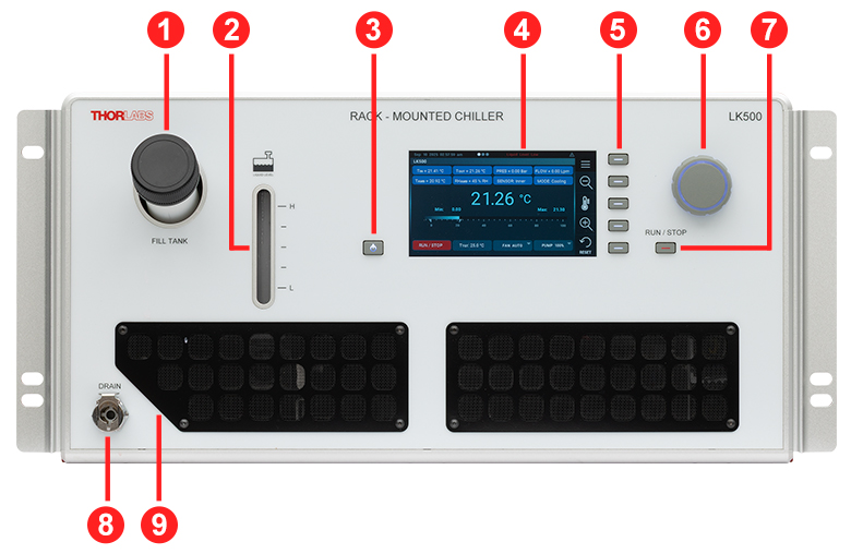 Thorlabs’ LK500 Rack-Mounted Chiller is an air-cooled liquid chiller that provides up to 500 W of cooling, 0.8 bar (11.6 psi) of pumping capability, and ±0.1 °C temperature stability. This compressor-refrigerant liquid chiller uses the environmentally friendly R290 as a natural refrigerant.