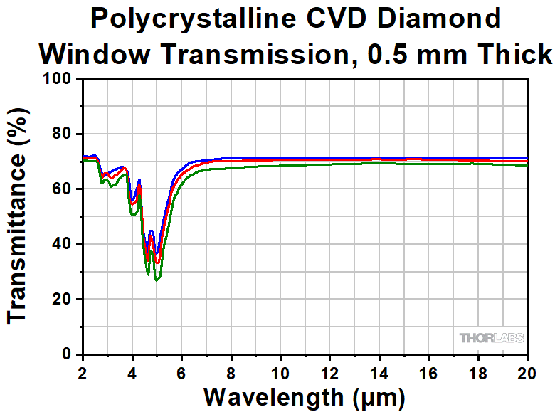 (posted 2024-02-02 09:32:16.0) Thank you for reaching out to us with this inquiry. This type of diamond has nominally a broadband transmission up to 100um and beyond, though we only really advertise it for up to 25um. Within this range the absorption of the material is relatively low (as you can see in the absorption coefficient graph) and most of the reduction in transmission comes from Fresnel reflections at each air-glass interface. Typical transmission for the low absorption coefficient regions (excluding the 2.5-7.5um region where large absorption occurs) will be approximately 70%. I have contacted you directly to discuss your particular wavelengths of interest. Gary Cook