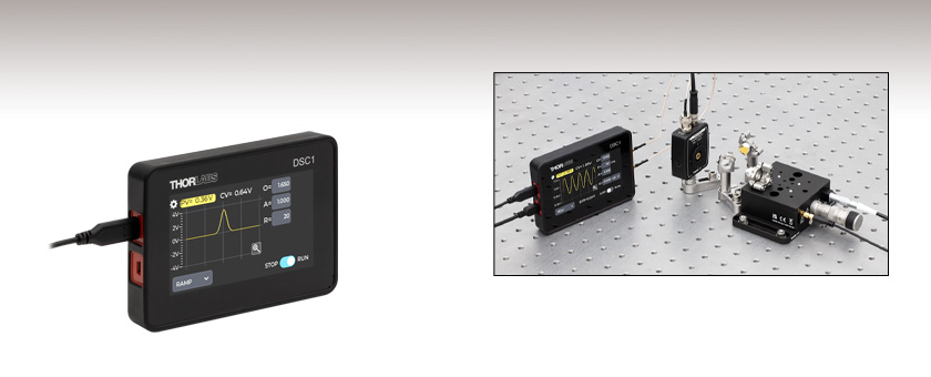 Thorlabs' DSC1 Compact Digital Servo Controller locks or stabilizes an optical system to an input voltage signal with real-time voltage feedback determined by a user-selected control algorithm. The controller has three modes that offer complementary functionality: Servo Lock mode, Peak Lock mode, and Ramp mode. The Servo Lock mode locks a system to maintain a constant specified value of the input voltage. The Peak Lock mode locks a system to a local peak or valley in the input voltage. The Ramp mode linearly sweeps the output voltage over a defined range for observation of the system's response.