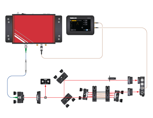 A DSC1 Compact Digital Servo Controller can be used to lock an interferometer to the peak or side of a single interference fringe by taking an input from a photodiode measuring the interferogram. The output of the DSC1 controller can then be passed to a piezo driver controlling a dynamic arm of the interferometer.