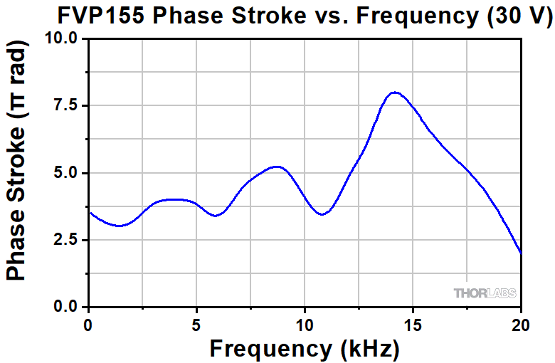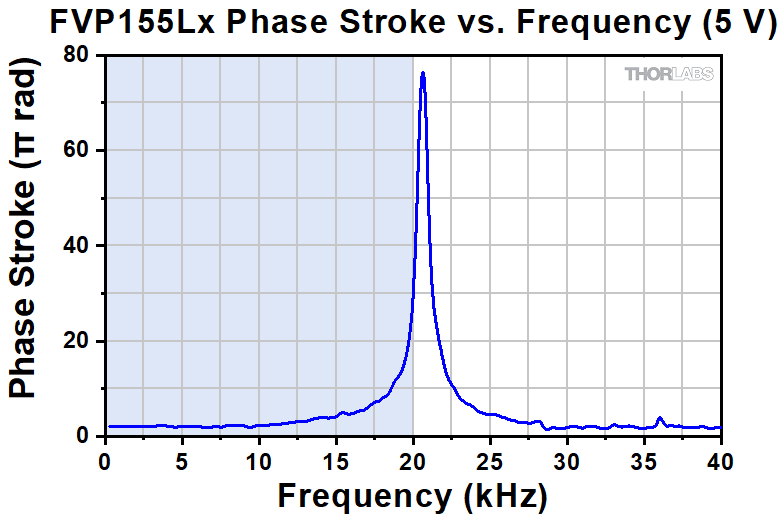 Figure 3.5 Sample data for FVP155L and FVP155LP Phase Shifters Phase Stroke Versus Frequency at 1550 nm. Recommended operating range is from 0 to 20 kHz, shaded in blue. The data shown is representative and may vary from device to device.