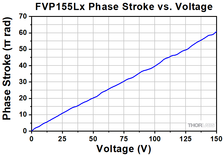 Figure 3.4 Typical FVP155L and FVP155LP Phase Shifter Phase Stroke Versus Input Voltage at 1550 nm, Measured With a 1 kHz Input Modulation Frequency