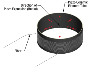 The FVP155, FVP155L, and FVP155LP Piezo-Based Fiber Phase Shifters alter the optical phase of light by stretching the fiber going through the devices. For the FVP155, the fiber is fixed to both ends of a piezoelectric ceramic, which elongates and thus stretches the fiber via the piezoelectric effect (see Figure 1.1). For the FVP155L and FVP155LP, the fiber is wrapped around a piezoelectric tube, which elongates the fiber as the tube expands radially (see Figure 1.2). The coil configuration allows for larger phase shifts by integrating longer sections of fiber, while minimizing the insertion loss by ensuring a low-bend-loss architecture. Please see the Graphs tab for typical graphs of the phase stroke versus the input voltage (Figures 3.1 and 3.4) and the phase stroke versus frequency (Figures 3.2 and 3.5). Our phase shifters are offered with FC/PC (narrow-key) connectors (Item # FVP155) and FC/APC connectors (Item #s FVP155L and FVP155LP).