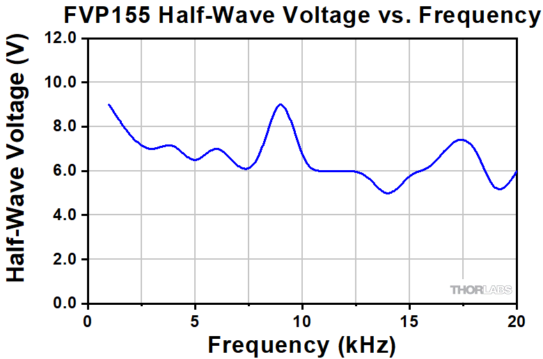 Figure 3.3 Sample data for FVP155 Phase Shifter Half-Wave Voltage Versus Frequency at 1550 nm. The data shown is representative and may vary from device to device.