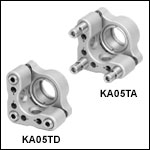 The KA05TA and KA05TD 3-Adjuster Ø1/2" PolarisKA Kinematic Mirror Mounts are designed to provide easy, high-resolution adjustment and the long-term alignment stability needed in industrial applications. Each mount features an SM05-threaded (0.535"-40) bore for mounting Ø1/2" optics up to 0.25" (6.4 mm) thick or SM05-threaded components. The three-adjuster design provides tip and tilt plus Z-axis (optical axis) adjustment. Two-adjuster versions are also available below.