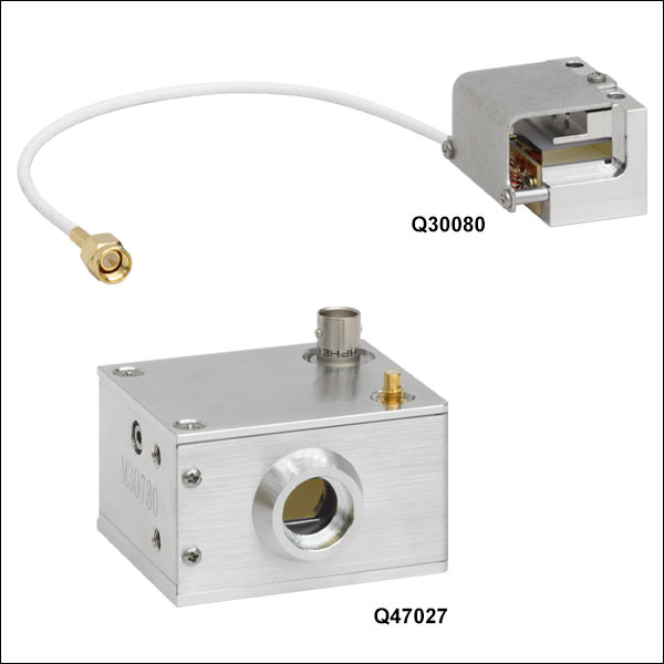The Q30080 Q-switch has an integrated SMA connector for providing the 80 MHz RF drive frequency, while the Q47027 Q-switch uses a BNC connector to provide the 27.12 MHz RF drive frequency. The Q47027 also includes a thermal interlock which is accessed via an SMC connector for connection to an RF driver. This interlock will open if a failure in the water circulation causes the temperature to rise to 50 °C, and will reset once the temperature has dropped back down to 30 °C.