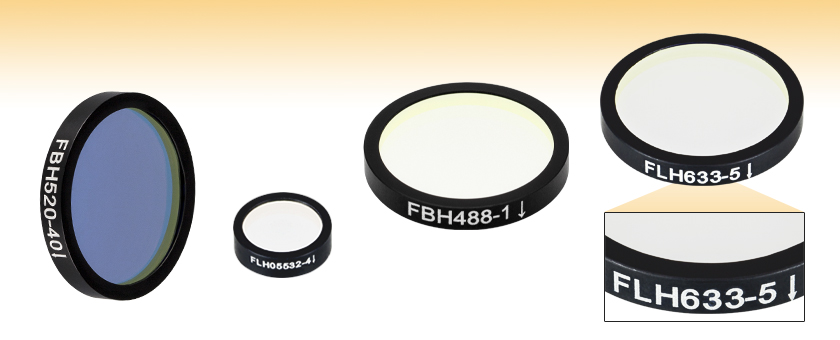 Each FBH series and FLH series filter is housed in a black anodized aluminum ring that is labeled with an arrow indicating the design propagation direction. The ring makes handling easier and enhances the blocking OD by limiting scattering. These filters can be mounted in our extensive line of filter mounts and wheels. As the mounts are not threaded, retaining rings will be required to mount the filters in one of our internally threaded lens tubes. We do not recommend removing the filter from its mount as the risk of damaging the filter is very high.