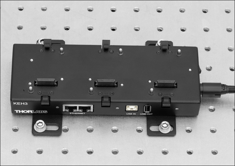 These Controller Hubs have been designed specifically with multiple K-Cube operation in mind. They simplify issues such as cable management, power supply routing, Ethernet connectivity, and multiple USB device communications. In addition, they make it possible to mount the electronic drivers on the optical table, next to all of the other mechanical components required to build an automated optomechanical application.