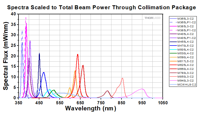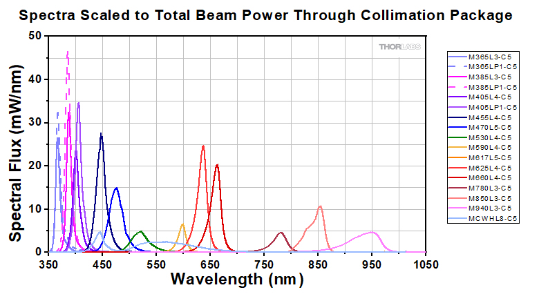 This tab includes all LEDs sold by Thorlabs. Click on More [+] to view all available wavelengths for each type of LED pictured below.