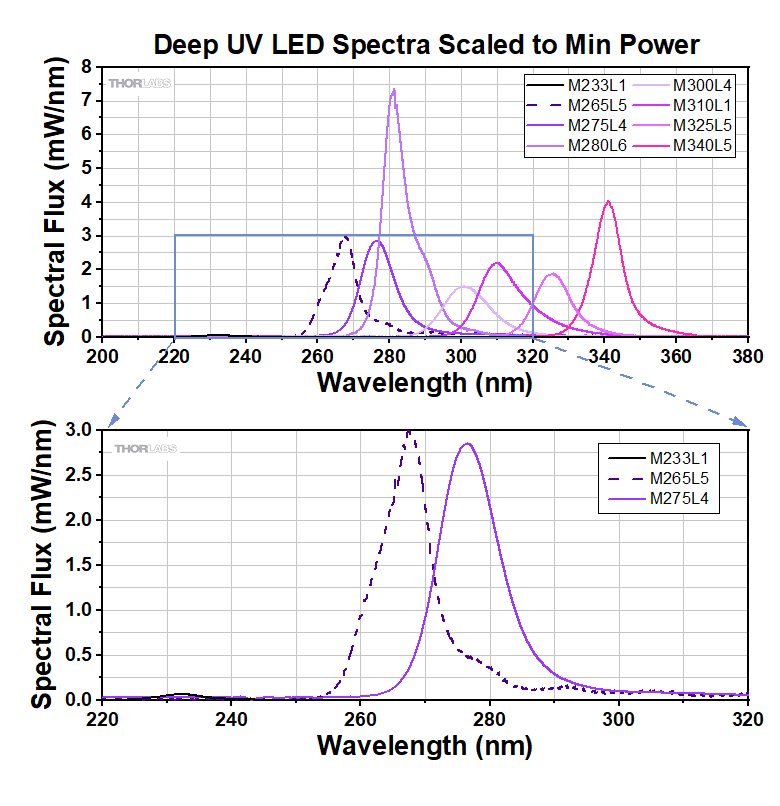 The actual spectral output and total output power of any given LED will vary due to variations in the manufacturing process and operating parameters, such as temperature and current. Both a typical and minimum output power are specified to help you select an LED that suits your needs. Each mounted LED will provide at least the minimum specified output power at the maximum current. In order to provide a point of comparison for the relative powers of LEDs with different nominal wavelengths, the spectra in the plots here have been scaled to the minimum output power for each LED. This data is representative, not absolute. Excel files with normalized and scaled spectra for each set of the mounted LEDs can be downloaded by clicking below the graphs.