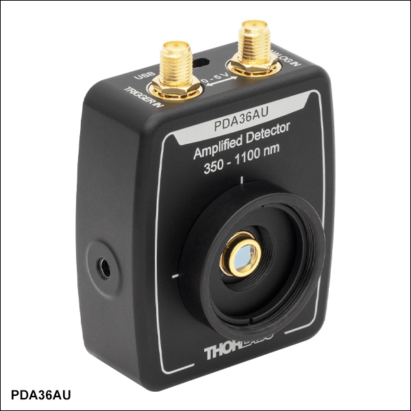 Our other switchable-gain devices with eight switchable maximum gain (bandwidth) combinations from 1.51 kV/A (11 MHz or 12 MHz for Item # PDA36Ax) to 4.75 MV/A (3 kHz) are the PDA100A2 detector, for detecting light from 320 to 1100 nm, and the PDA36A2 and PDA36AU detectors, for detecting light from 350 to 1000 nm. The PDA36AU detector is USB-powered and has a 16-bit DAQ with a 1 MS/s sampling that is used with a Windows PC running our PDA Software to read the detector signal and an additional analog input signal and to control the gain and trigger settings. The software functions as a virtual two-channel oscilloscope; please see the Software tab for details. The PDF10A2 with femtowatt sensitivity is a low-frequency device that should only be terminated into high impedance (Hi-Z) loads, while all of our other silicon amplified photodetectors are capable of driving loads from 50 Ω to Hi-Z. Please see the Specs tab for the full specifications of each device.