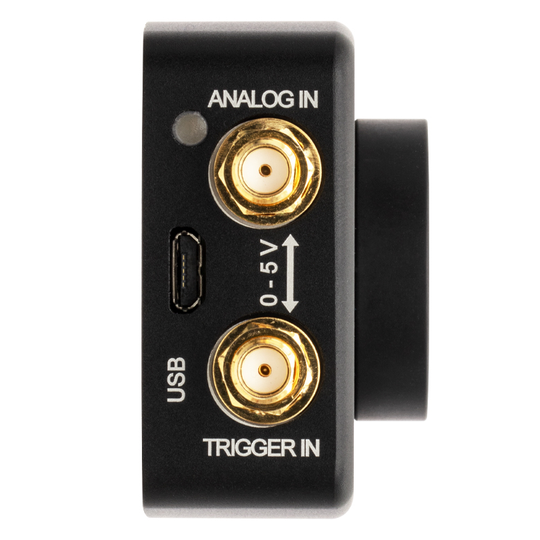 The PDA36AU Si Switchable-Gain USB DAQ Detector is a silicon (Si) detector with a 16-bit DAQ that has a 1 MS/s sampling rate. The PDA Software, downloadable from the Software tab, reads the signal from the detector and an additional analog input signal that can be connected to an SMA connector (ANALOG IN) at the top of the unit. A USB 2.0 connection to a computer via a USB Type Micro-B connector powers the device and provides a connection for the software to read and display the signals from the DAQ and optional analog input. An input trigger can also be connected to the device via a separate SMA connector (TRIGGER IN), and the trigger settings can be controlled with the software; see Figure 3.2 in the Housing Features tab for its location.