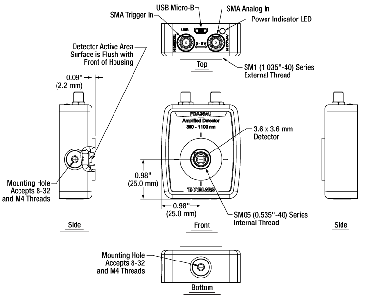 Every PDA or PDF series detector has internal SM05 (0.535"-40) threading and external SM1 (1.035"-40) threading, and the housing features universal taps that accept both 8-32 and M4. For more information about the location of these mounting points and mounting these units, please see the Housing Features tab. They include an SM1T1 lens tube, an SM1RR retaining ring, and a plastic dust cap that protects the active area when not in use (Item # SM1EC2B, replacements sold in packs of five). They also have the active area and responsivity curves marked on the back of the device, see Figure 1.4.