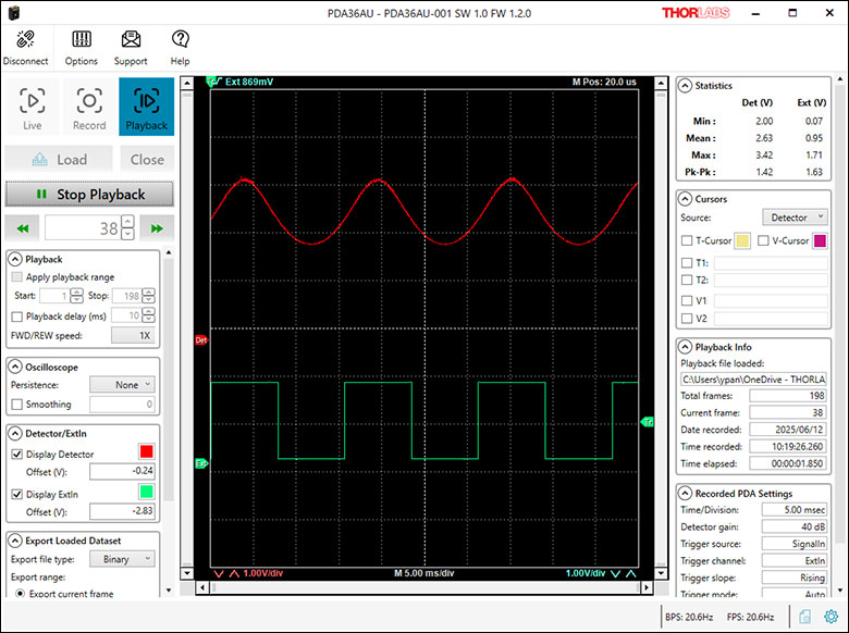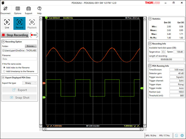 - Thorlabs PDA Software Provides a Virtual Two-Channel Oscilloscope to Read the Detector Signal and an External Analog Signal, and to Control the Acquisition Timing and Display Settings