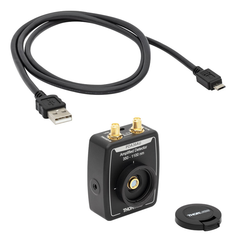 The PDA36AU detector comes with an SM1TI coupler, SM1RR retaining ring, USB 2.0 Type-A to Micro-B cable, and a snap-on plastic dust cap (Item # SM1EC2B, replacements are sold in packages of five).