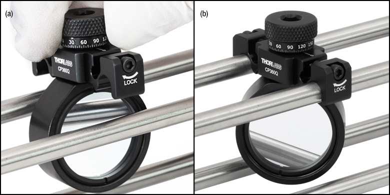 The CP360Q(/M) drop-in cage mount allows for 360° rotation of a Ø1" optic within a 30 mm cage system. To insert one of these mounts into a cage system, turn the optic perpendicular to the optical axis, and snap the mount onto adjacent cage rods before tightening the socket-head screw in each flexure clamp using a 5/64" (2.0 mm) hex key (not included).