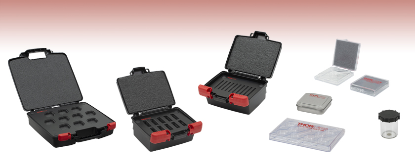 Thorlabs offers polystyrene and metal storage boxes for unmounted, individual optics. The BX01 and BXM1 Storage Boxes are for Ø1" optics, the BX02 Storage Box is for Ø2" optics, and the BX03 Storage Box includes foam inserts for optics up to Ø2.5". If the need arises to store or transfer multiple unmounted optics at one time, we offer the BX0510 and BX0110 Storage Boxes, which can hold up to ten Ø1/2" and Ø1" optics, respectively, reducing the amount of space needed to store the optics and makes large quantities of optics easier to transport.