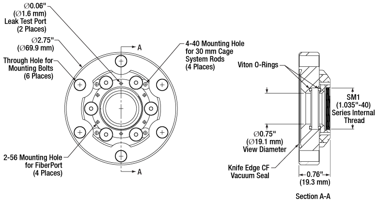 Thorlabs' Ø2.75" CF flange viewports allow for optical access into high-vacuum (HV) systems down to 10-8 Torr. These are fixed (non-rotating) flanges with Ø1" windows that provide a Ø0.71" (Ø18 mm) clear aperture (CA). Note that the CA is limited by the optic rather than the flange's internal diameter. These viewports have six 1/4" (M6) through holes for bolting onto any standard Ø2.75" CF flange. Please note that mounting hardware is not included. Our HV CF viewports can be purchased with one of three uncoated windows: sapphire, CaF2, or UVFS. Additionally, the provided window may be replaced with any of our Ø1" flat windows that are 4.9 - 5.15 mm thick.