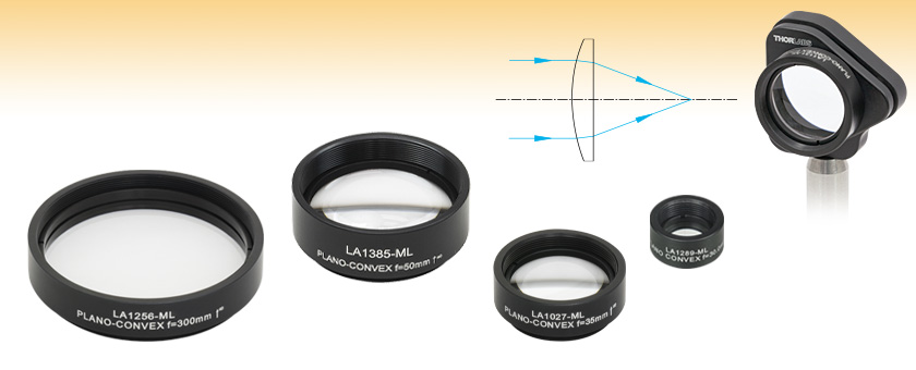 Like all plano-convex lenses, these lenses have a positive focal length and near-best-form shape for infinite and finite conjugate applications. They can be employed to converge collimated beams or collimate light from a point source. To minimize the introduction of spherical aberration, a collimated light source should be incident on the curved surface of the lens when being focused and a point light source should be incident on the planar surface when being collimated.