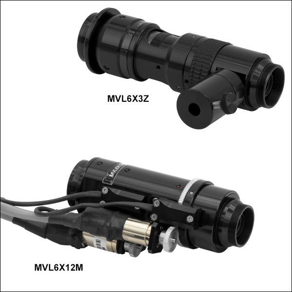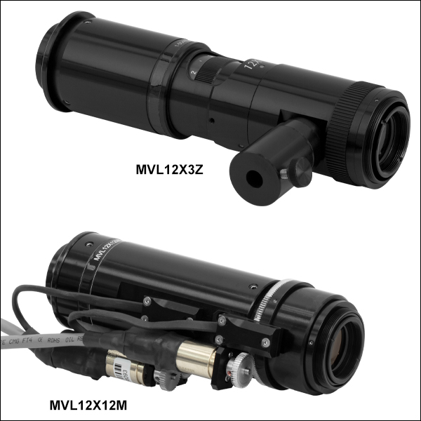 Our 12X Zoom Lenses feature a variable magnification of 0.58 - 7X, which provides a 12X magnification adjustment (zoom) range. The MVL12X12Z and MVL12X12M provide 12 mm of fine focus travel for a large working distance range, while the MVL12X3Z and MVL12X3M provide 3 mm of fine focus travel. The MVL12X3Z also includes a coaxial illumination port, which is compatible with the fiber bundles included with our OSL2 and OSL2IR fiber light sources and our Ø5 mm liquid light guides. The MVL12X3M has 11/16"-32 internal threading, which when paired with MVL12X8C fiber input attachment (sold below) provides the same compatibility.