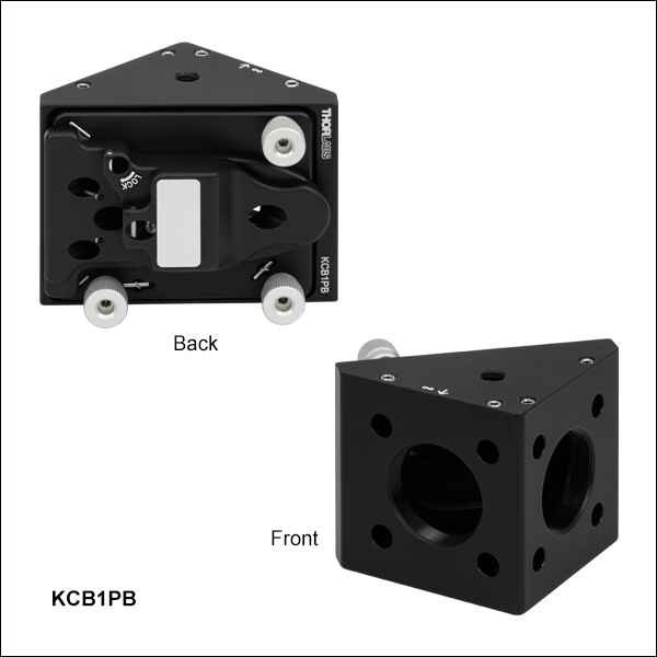 The KCB1P5(/M) and KCB1PB(/M) right-angle mounts provide pitch and yaw adjustment for a Ø1/2" (Ø12.7 mm) (Item # KCB1P5(/M)) or a Ø1" (Ø25.4 mm) (Item # KCB1PB(/M)) off-axis parabolic (OAP) mirror mounted on a plate that positions the surface of the mirror at a 45° angle. The ports are equipped with SM1-threaded (1.035"-40) bores and four 0.25" (6.4 mm) deep smooth bore holes spaced to mate with our 30 mm cage system. The cage rods are secured by eight setscrews using a 5/64" (2.0 mm) hex key or balldriver. This design allows multiple 30 mm cage components to be directly interfaced without the need for ERSCB ER Rod Adapters. The kinematic pitch and yaw adjustment plate is actuated with 100 TPI (Threads Per Inch) adjustment screws that provide an angular resolution of 7.6 mrad/rev. The knob on each adjuster is removable. While the optic face is nominally centered within the mount, the third adjuster can be used for fine tuning the position along the optical axis.