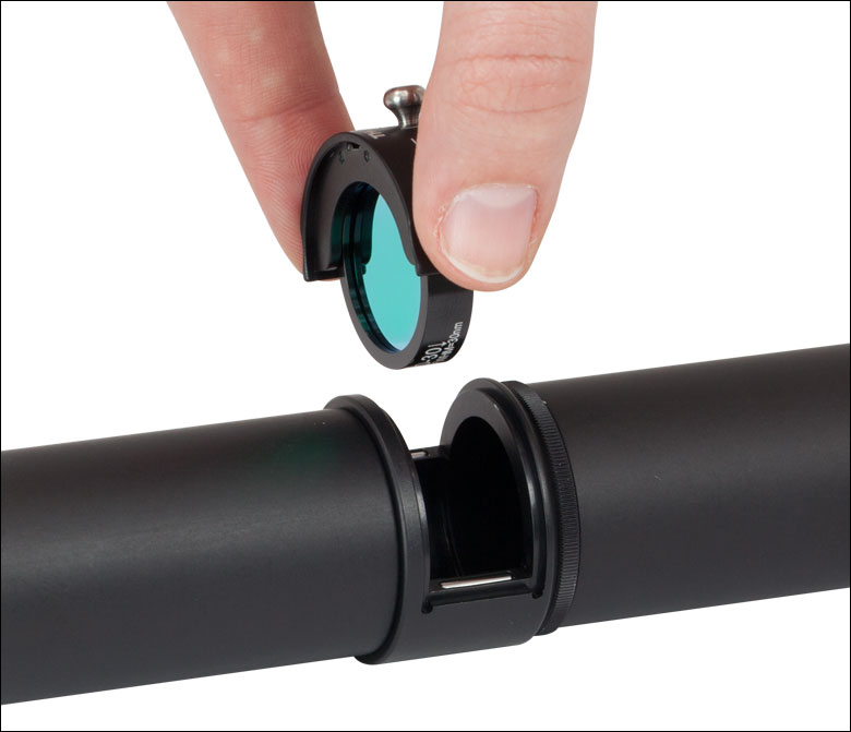 To install a filter in the carriage, first separate the filter carriage from the slotted lens tube by gripping the recessed grooves on either side of the carriage and pulling gently. Slide the top-located stainless steel knob in the direction of the engraved arrows (as shown in Figure 1.1). This opens the spring-loaded clamp located on the underside of the carriage. Insert the filter, pressing it firmly against the underside of the holder, and release the knob. See Video 1.3 for details.
