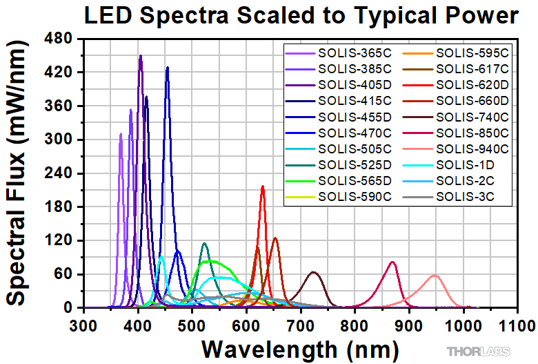 Figure G1.3 This plot compares the spectral flux of the Solis® LEDs. In order to provide a point of comparison for the relative powers of LEDs with different nominal wavelengths, the spectra have been scaled to the typical output power for each LED. This data is representative, not absolute. An Excel file with normalized and calculated scaled spectra for all of the Solis high-power LEDs can be downloaded by clicking on the link in this caption.