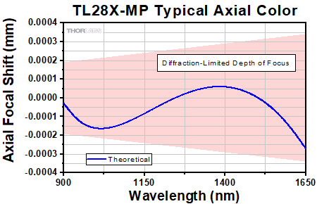 Axial color describes the shift in the image plane across the operating wavelength range of the 1X super apochromatic microscope objective. The pink shaded region denotes diffraction-limited performance.
