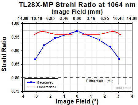 The Strehl Ratio is a quantitative measurement of optical image formation quality. The Strehl Ratio for the TL2X-SAP over its field of view is shown in the graph above.