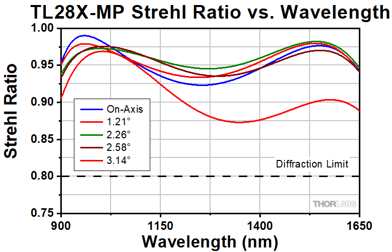 This graph shows the Strehl Ratio of the TL1X-SAP over the objective's full operating wavelength range.